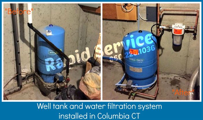 We received a phone call on a Saturday from one of our Columbia CT homeowners. He requested plumbing service because he found a leak near his well tank. Our on-call plumber technician arrived at the home on the same day. He quickly diagnosed the problem. The well tank was very old and starting to rust. In addition, the water filter above it was leaking. After providing several repair options to our customer, he chose one that best met his needs and budget. The old well tank was cut out and we disposed of it. The old water filter was also cut out and disposed of. A new well tank and sediment filter were installed with all new piping in a location that was a better fit for the equipment. With proper maintenance, the new plumbing should last another 20-30 years. The water filtration system will prolong the life of all the faucets in the home. Catching the well tank leak before it failed prevented a plumbing emergency. A bad well tank will leave you witho ut water and can burn our your well pump. Rapid Service LLC provides emergency plumbing service but always urges homeowners to be proactive.